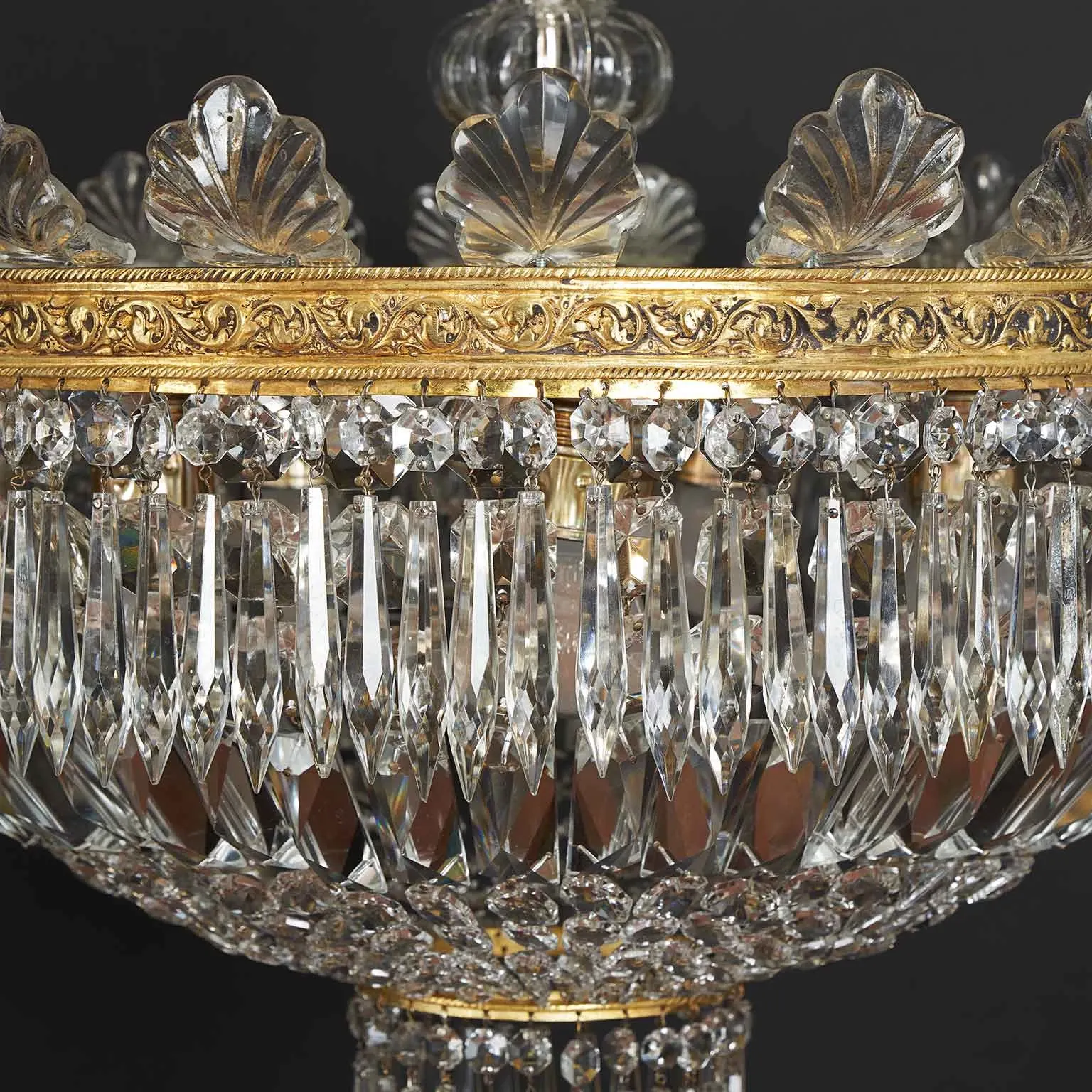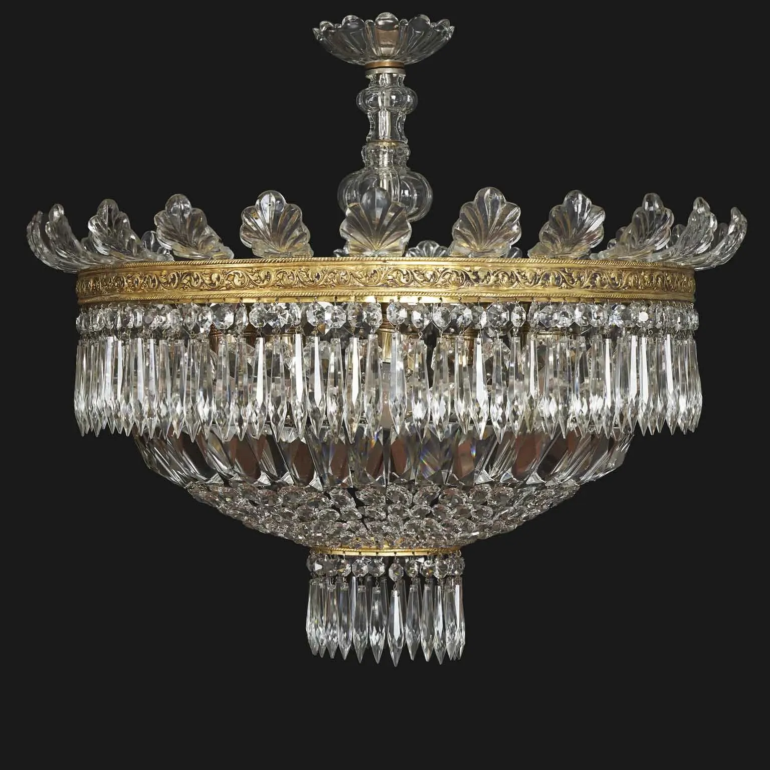 Z tej obręczy wyłania się kaskada kryształów, tworząca miękki układ łańcuchów fasetowanych, kryształowych ośmiokątów o różnych rozmiarach, połączonych w środku okrągłym metalowym pierścieniem i innymi spiczastymi kryształami, zawieszkami i rzeźbionymi kryształowymi pryzmatami o włóczniach.