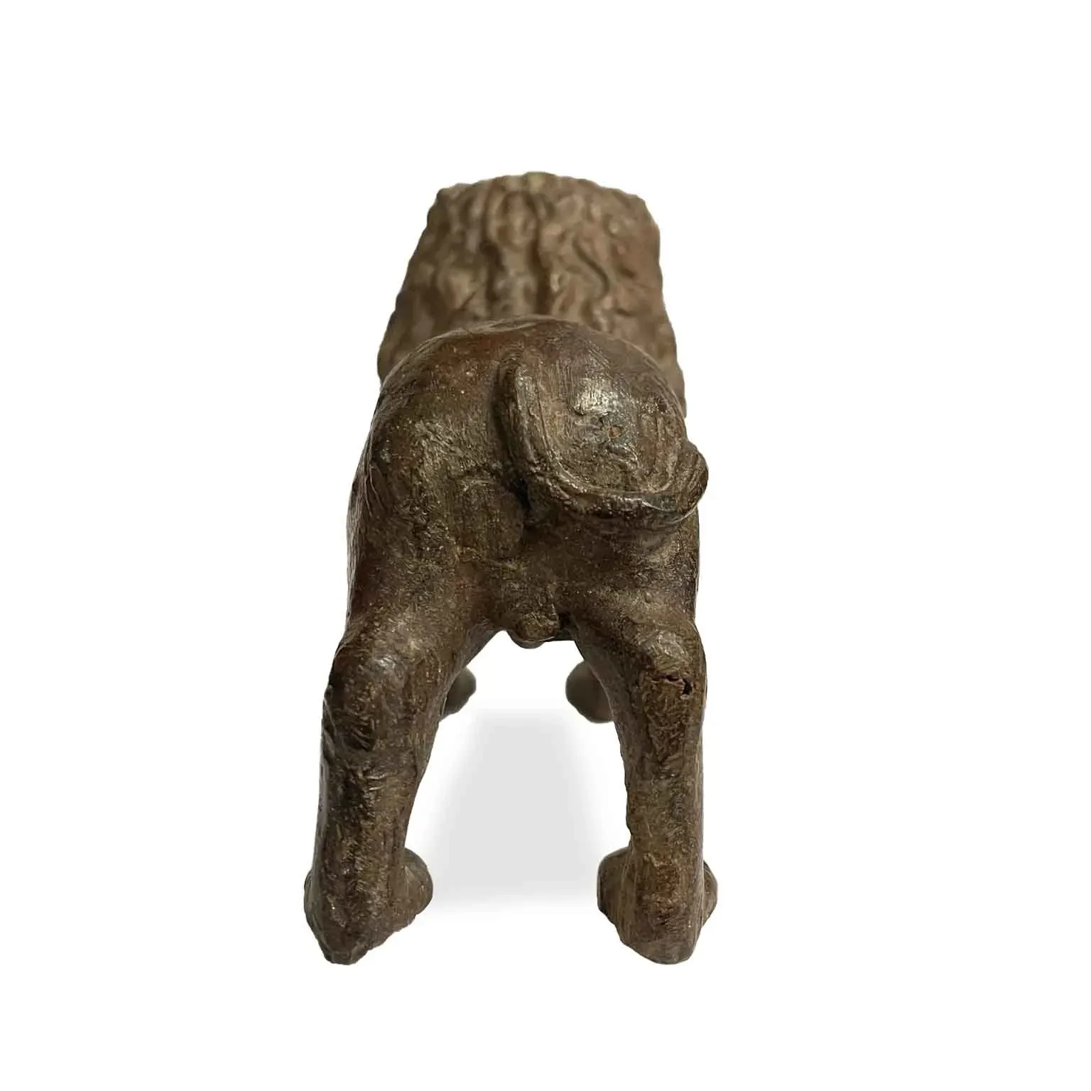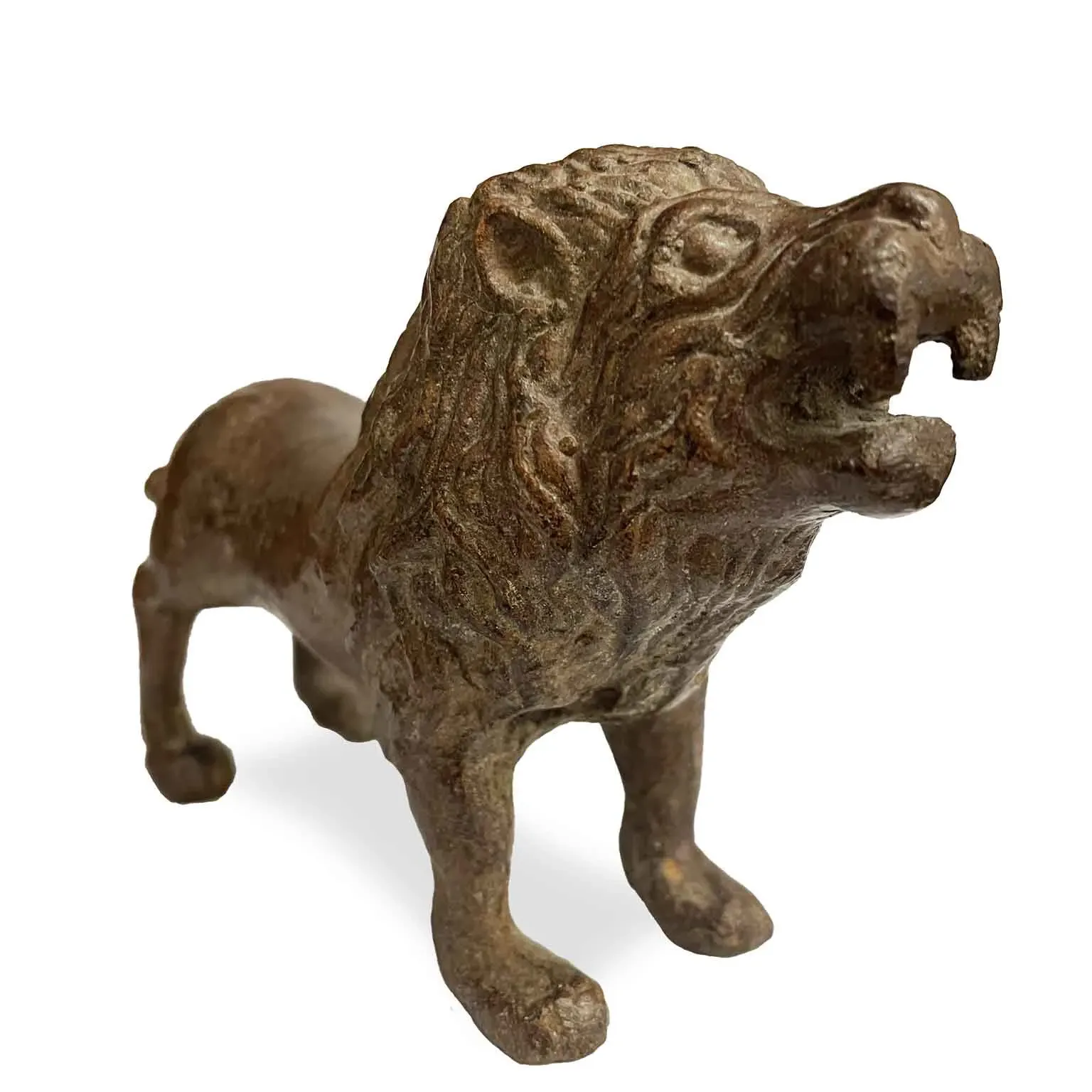 Odlew z brązu ziemnego, przedstawiający ryczącego lwa w agresywnej pozie. Pochodzi z prywatnej kolekcji, w dobrym stanie, z piękną brązową patyną.