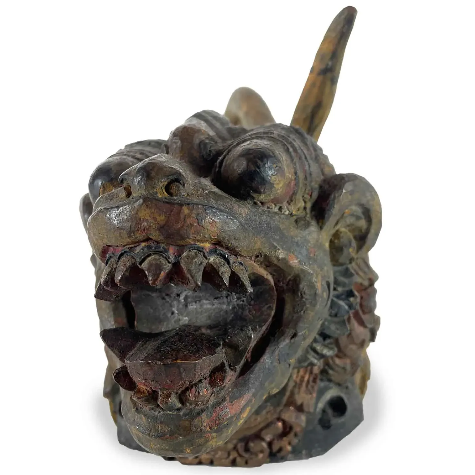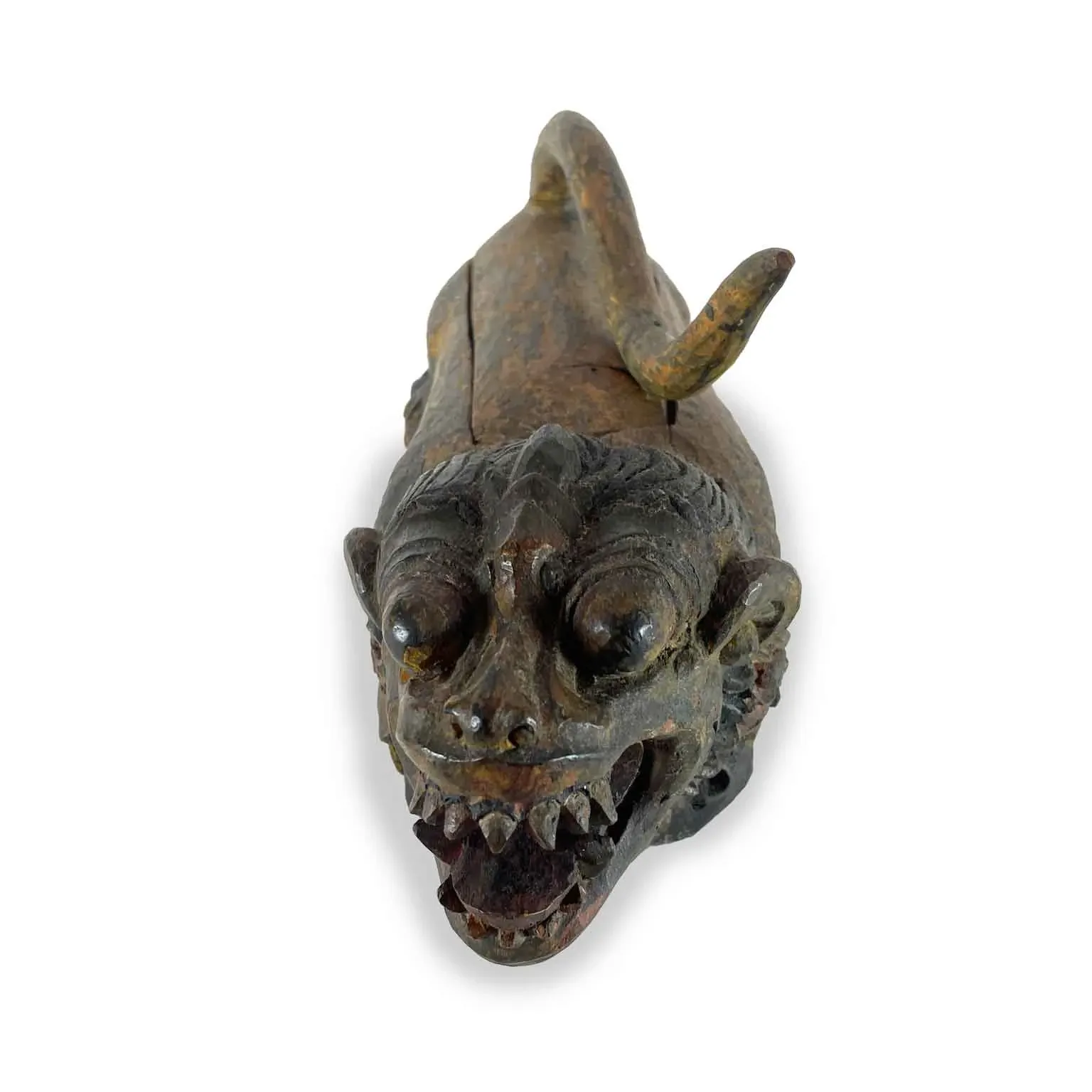 Ta indochińska Fantastyczna Bestia, wyrzeźbiona z jednego kawałka egzotycznego drewna, ze śladami polichromii i złoceń, przedstawia postać przypominającą lwa z ostrymi zębami i groźnymi pazurami.