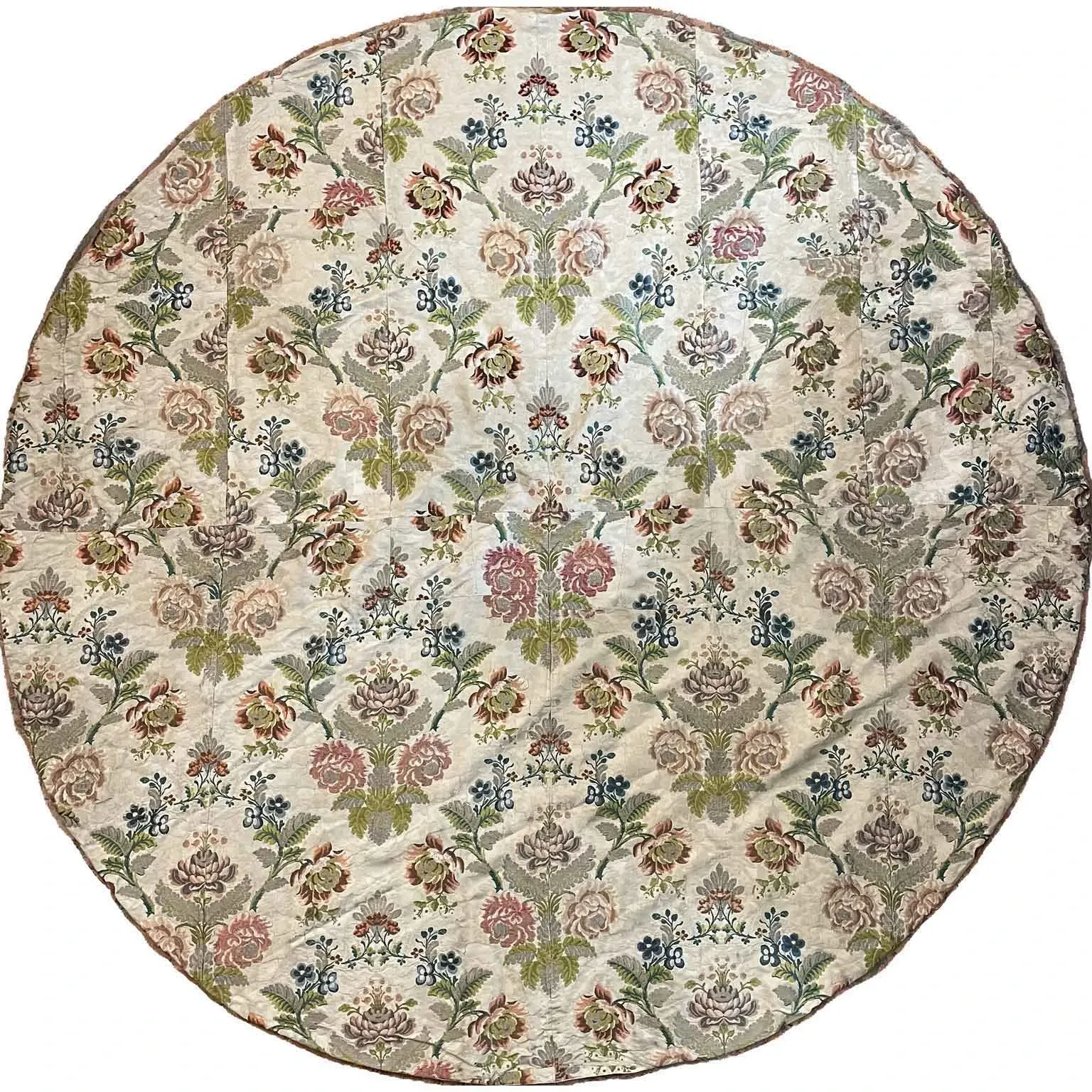 Okrągły obrus z haftem z XVIII wieku, wykonany z pasków wzorzystej tkaniny, tworzący bezszwowy wzór adamaszku z różami, fantazyjnymi kwiatami i liśćmi, haftowany bawełną i srebrną lamą. Ten zabytkowy, okrągły obrus z tkaniny ma ślady użytkowania i zagniecenia, co jest udokumentowane w galerii zdjęć, co wskazuje na jego pochodzenie z XVIII wieku.