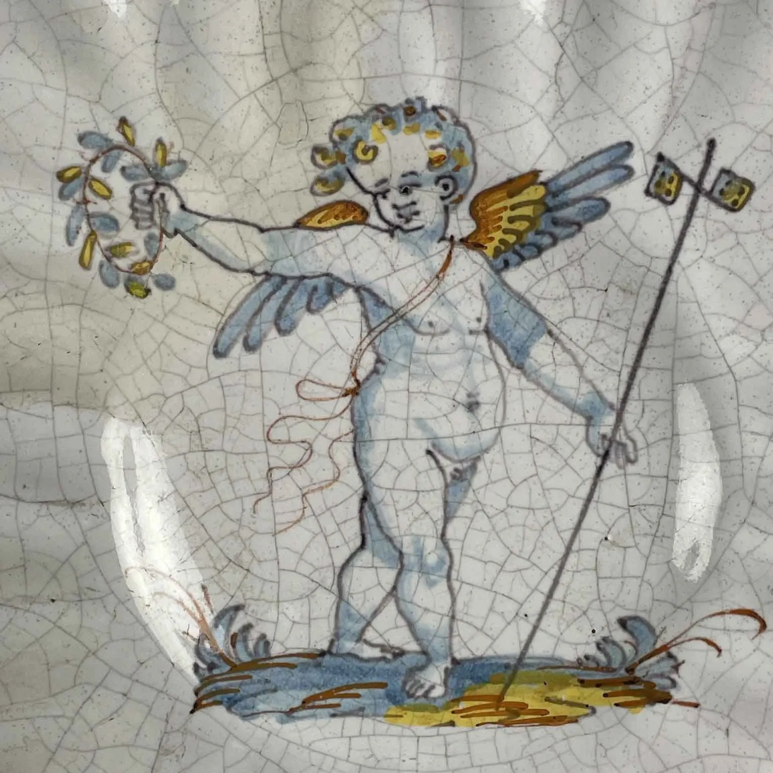 Majolica Crespina z dekoracją Compendiario, Deruta, 1700, przedstawiająca uskrzydlonego cherubina (lub Kupidyna). Cherubin trzyma wieniec laurowy (symbol zwycięstwa lub cnoty) i laskę z dwoma małymi proporczykami lub serpentynami. Krawędź jest „płatkowata” lub „pomarszczona”, a jej falisty kształt nadaje dziełu dynamiki.