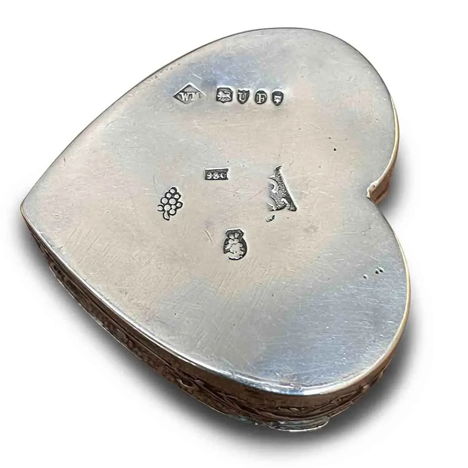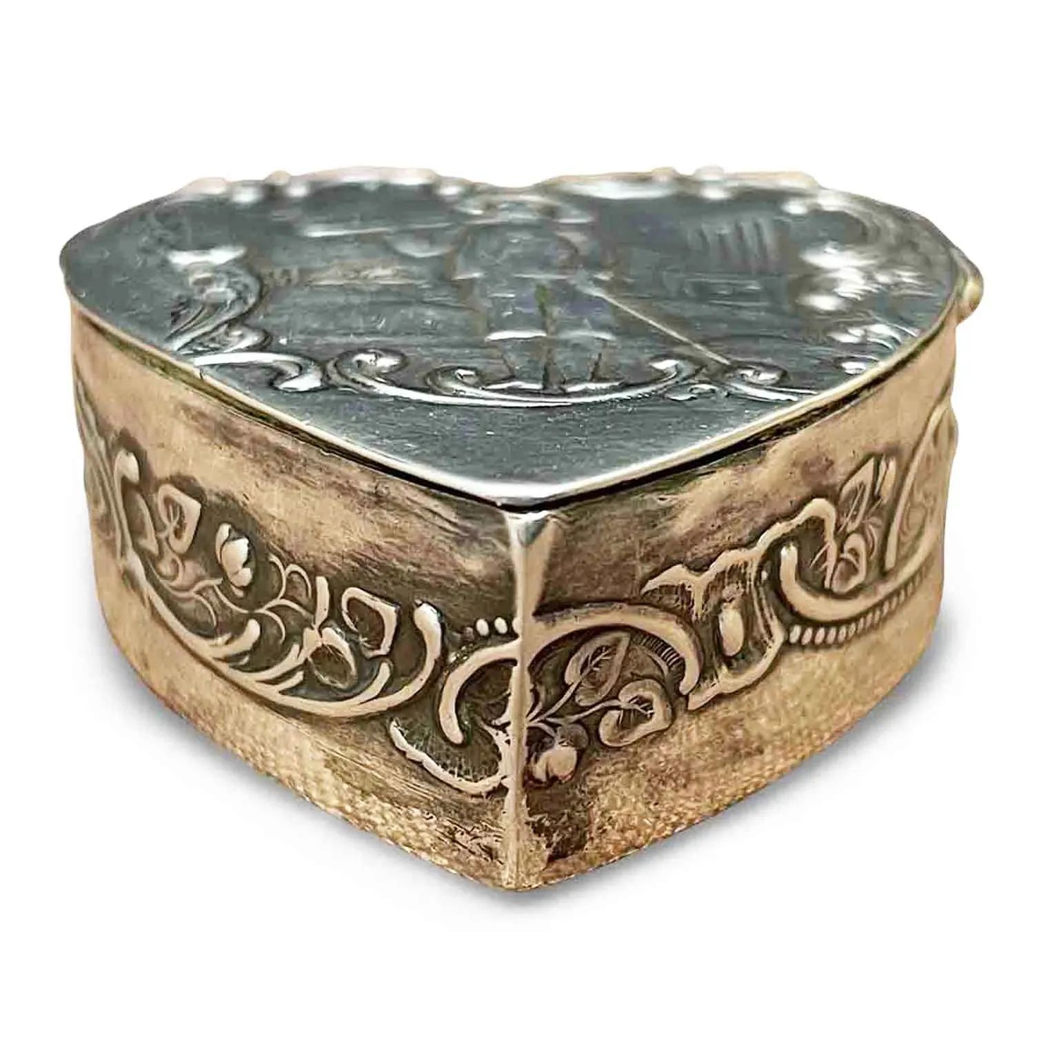 Pudełko na pigułki w kształcie serca wykonane jest ze srebra wysokiej próby. Pochodzi z prywatnej kolekcji w Lombardii i jest w dobrym stanie, bez śladów zużycia.