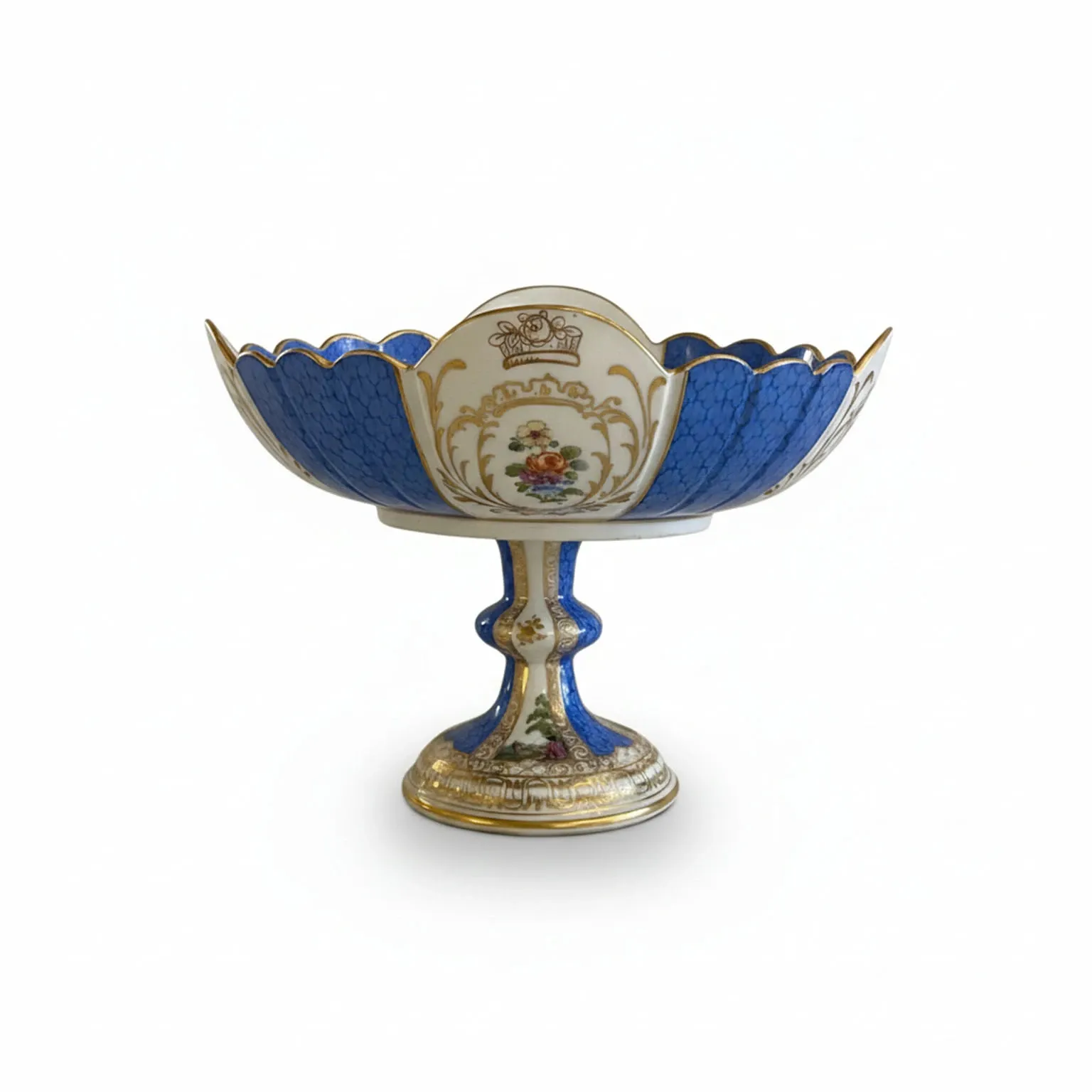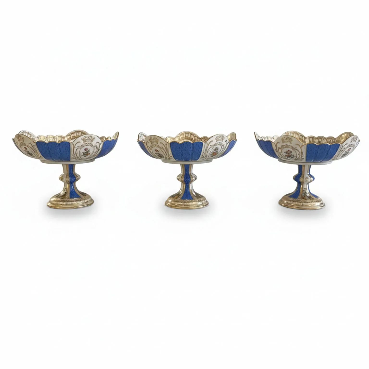Trzy misy na owoce z porcelany miśnieńskiej i złota, 1850, w dobrym stanie. Ten zestaw trzech mis jest ręcznie malowany złotymi kwiatami, liśćmi i roślinnością na niebiesko-białym tle. Misa jest polichromowana i podzielona na sekcje z bardzo szczegółowymi postaciami, scenami romantycznymi i pejzażami, przeplatanymi niebieskimi fragmentami. Cała misa jest obramowana piękną bordiurą.