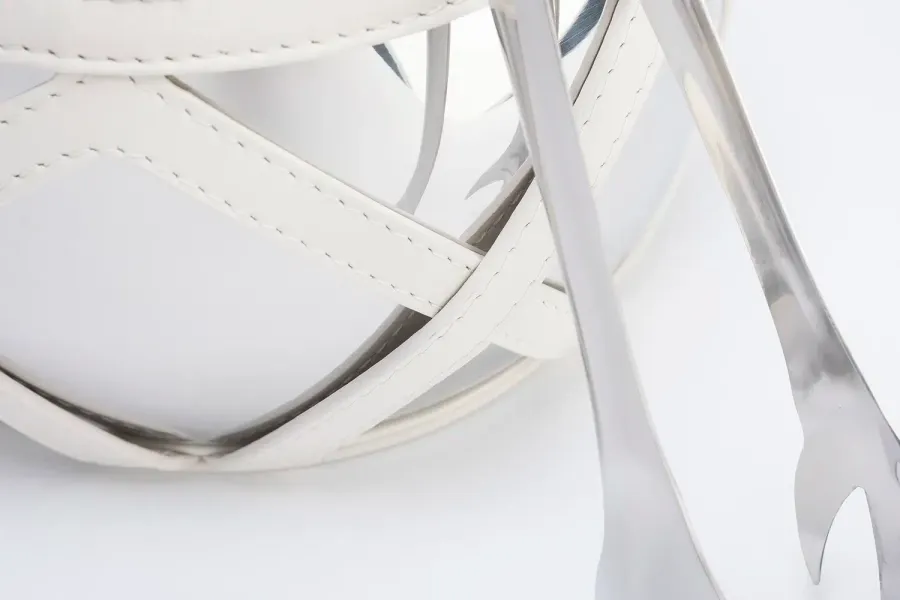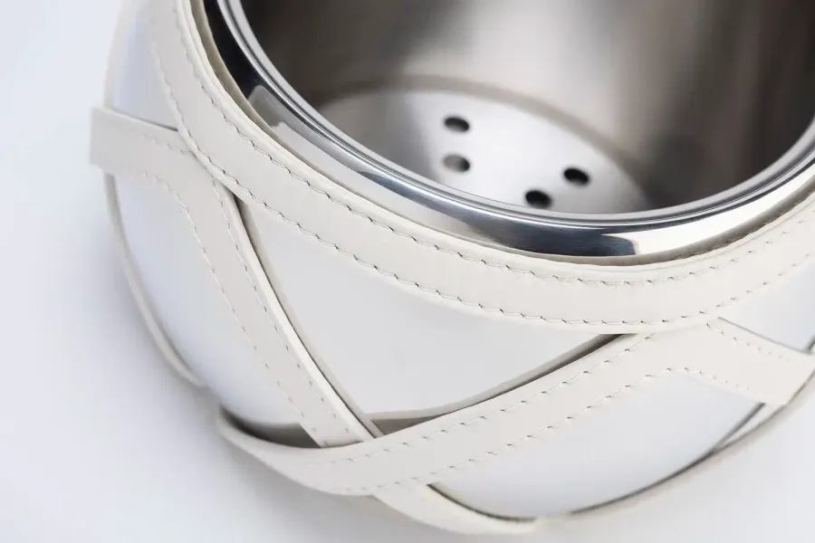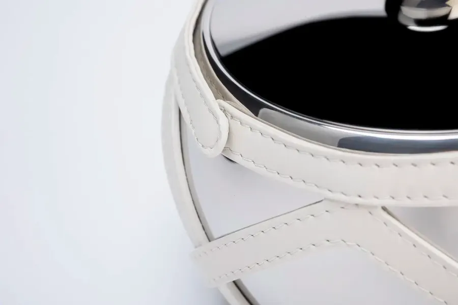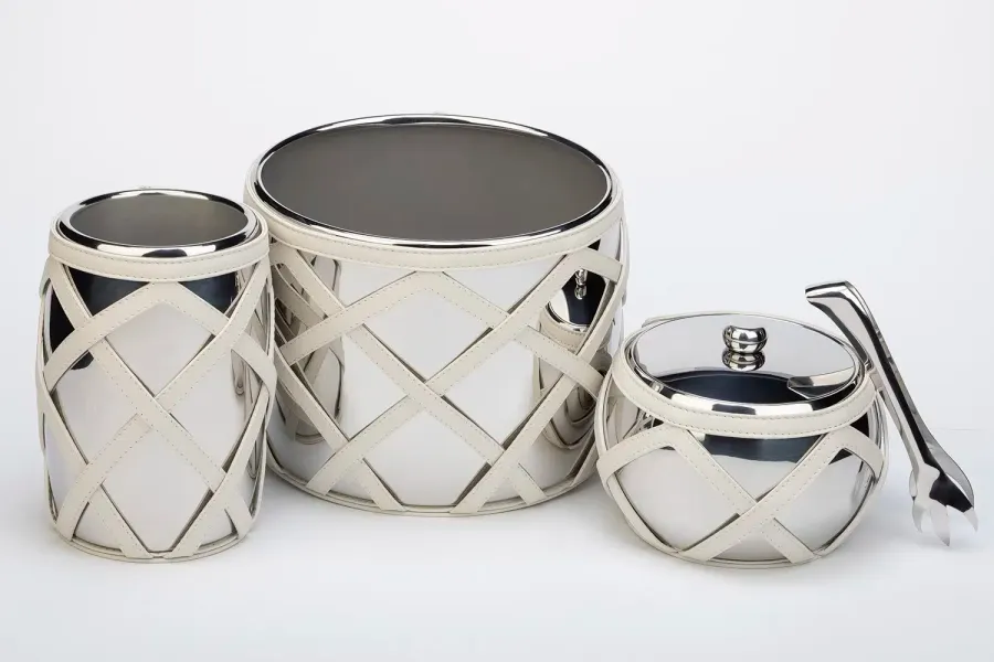 Termiczny pojemnik na lód z pokrywką, należący do kolekcji Escher, idealnie nadaje się do utrzymywania niskich temperatur, zachowując jednocześnie artystyczny i urzekający design. Zgodnie z charakterem kolekcji, posiada przeplatane skórzane paski, które tworzą romboidalne wzory inspirowane misternymi pracami Eschera.