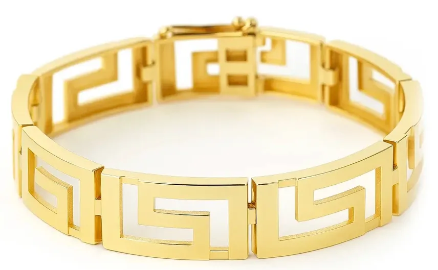 Bransoletka pełna wyrafinowanej klasy i niezwykle efektowna. Grecki blask zachwyca harmonią proporcji i ponadczasowym pięknem klasycznego, greckiego wzoru. 12 mm szerokości sprawia, że bransoletka jest bardzo wyraźna i zarazem bardzo prestiżowa. Kompozycja oparta o 9 precyzyjnie dopasowanych elementów zaprojektowana został w taki sposób, aby idealnie układać się na dłoni. Dzięki temu bransoletka jest nie tylko efektowna ale również bardzo wygodna podczas codziennego noszenia.