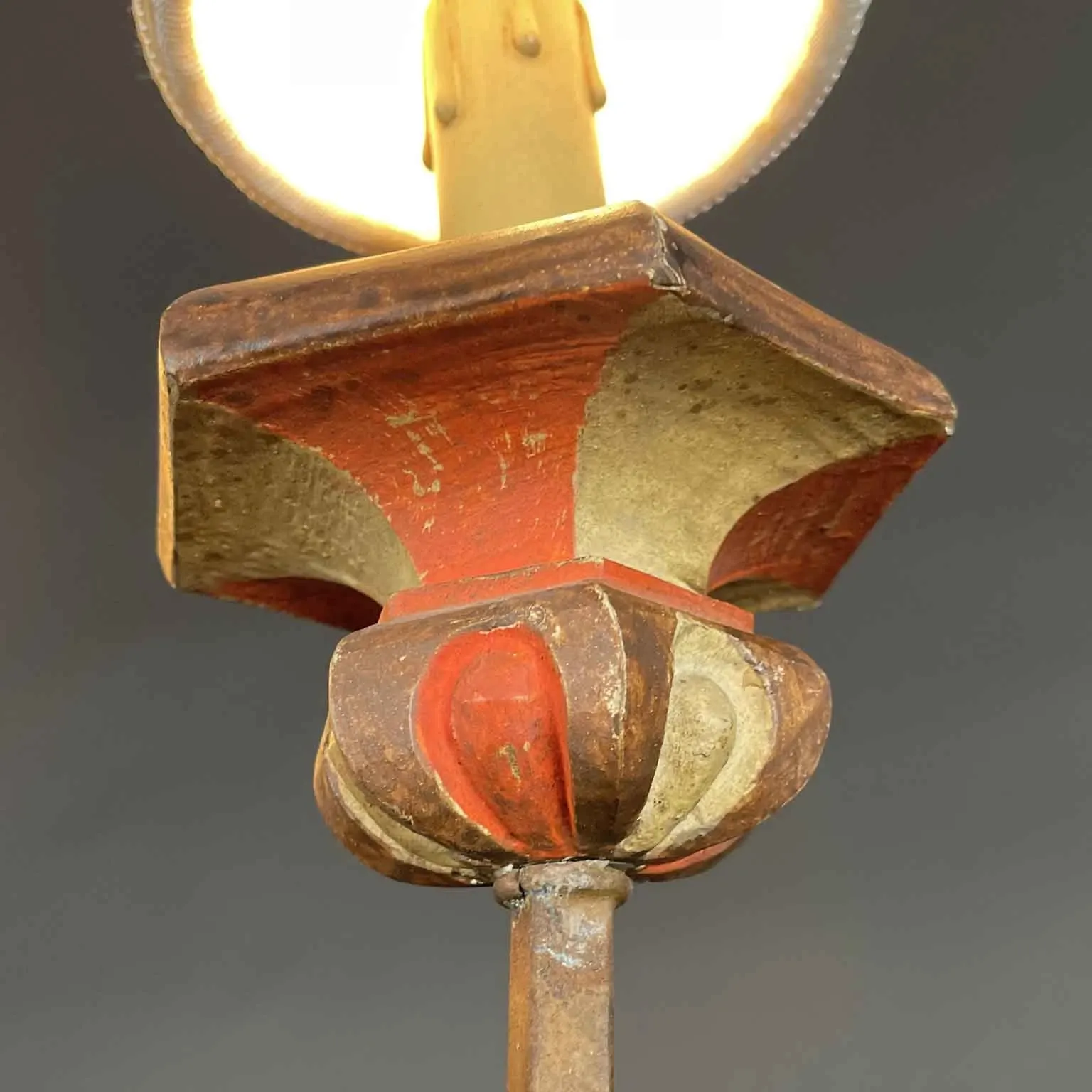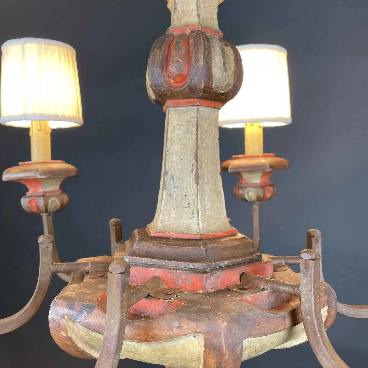 Żyrandol z lakierowanego drewna z centralnie rzeźbionym trzonem z drewna o przekroju sześciokątnym, lakierowanym w odcieniach kości słoniowej i czerwieni; sześć kwadratowych ramion wykonanych jest z żelaza z rdzawym wykończeniem.